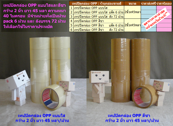 มีให้เลือกใช้ทั้งแบบ เทปใส และ สีชา หน้ากว้าง 2 นิ้ว ยาว 45 หลา